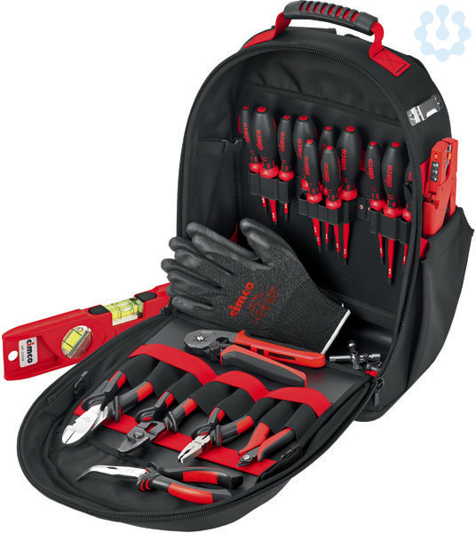 Robuster Werkzeugrucksack aus wetterfestem Material verfügt über Zahlreiche Werkzeugaufnahmen: Taschen, Ösen, D-Ringe und Stecksystem für Handwerkzeuge. Die Schultergurte und der Rücken dieses Rucksacks sind ergonomisch gepolstert und ermöglicht ein komfortables Tragen. Das Riemensystem ermöglich verschiedene Öffnungswinkel. Werkzeugrucksack-Bestückung: 1 x VDE-Kabelschere, für Kabel 18 mm², 1 x 1000 V Kraft-Seitenschneider 200 mm, 3 x VDE-Schlitz-Schraubendreher SLIM, 2 x VDE -Schraubendreher mit Kombiprofil SLIM, 2 x VDE-Kreuzschlitz(PZ)-Schraubendreher SLIM, 4 x VDE-TORX®-Schraubendreher SLIM, 1 x Elektronik-Seitenschneider ohne Schneidwate 132 mm, 1 x Universal-Schaltschrankschlüssel, 1 x Profi-Schaltschrank-Wasserwaage 250 mm, 1 x Automatische Abisolierzange für flexible Leiter, 1 x Presszange Click`n`Crimp, 1 x Steckschlüssel-Bit-Halter, 1 x Spannungsprüfer 690 V, 1 x Bit-Box Schlitz, 10-teilig PH/PZ, 1 x Schraubenzange, 160 mm