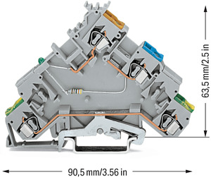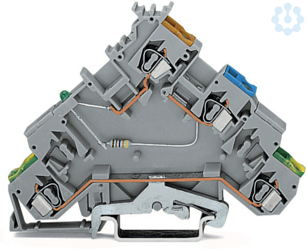 4-Leiter-Initiatoreneinspeiseklemme. LED grün. für PNP-(plus-)schaltende Initiatoren. Einspeisung auf der Initiatorenseite. mit farbig bedruckten Leitereinführungen. 2,5 mm². CAGE CLAMP®. 2,50 mm². grau
