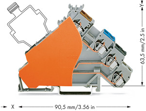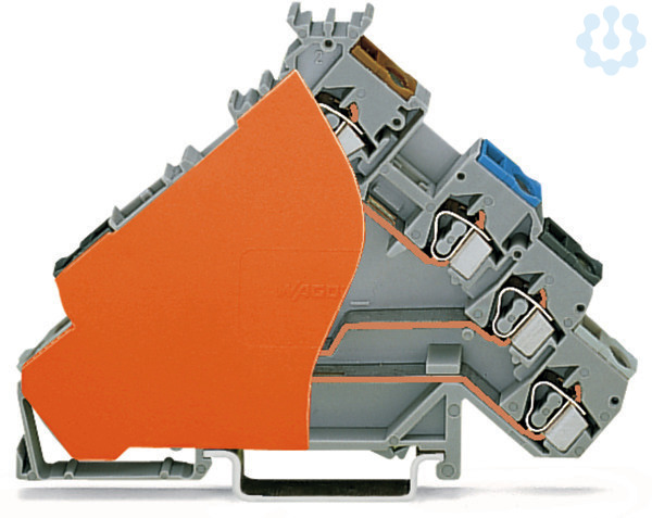 4-Leiter-Initiatorenklemme. für PNP (plus)-schaltende Initiatoren. für Sicherungsstecker. mit orangefarbener Abschlussplatte. mit farbig bedruckten Leitereinführungen. 2,5 mm². CAGE CLAMP®. 2,50 mm². grau