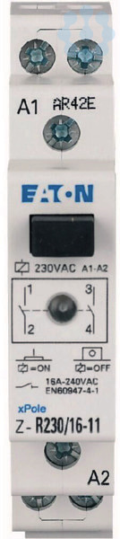 Installationsrelais mit Handbetätigung, Steuerspannung 24V AC, Funktion: 2 S, Bemessungsbetriebsstrom 16 A, 240V AC, erfüllt die Anforderungen der IEC/EN 60947-4-1, Standard Front Abmessung 45mm, Montagebreite 1 TE, Montage auf Hutprofilschiene.