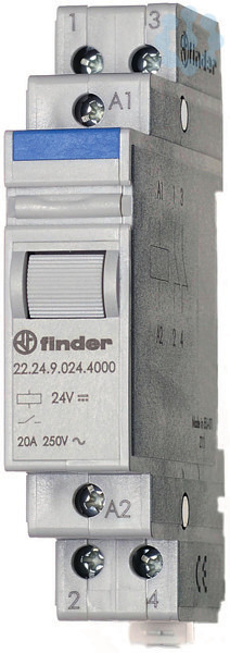 Installationsrelais für 35 mm-Schiene, 2 Öffner für 20 A / 250 V AC, Kontaktmaterial AgSnO², max. Schaltleistungen bei 230 V AC: AC1 5000 VA, AC15 1000 VA, Glüh- und Halogenlampen 1000 W, Leuchtstofflampen mit EVG 400 W, Leuchtstofflampen mit KVG 360 W, Energiesparlampen 200 W, LED (230 V AC) 200 W, NV-Halogenlampen oder LED mit EVG 200 W, NV-Halogenlampen oder LED mit KVG 400 W, Spulendaten: 24 V DC, 1,25 W, 460 Ohm, Breite 17,5 mm, Prüftaste, Relaisschutzart: IP 20
