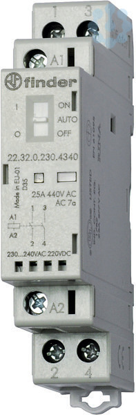 Installationsschütz für 35 mm-Schiene, 2 Schließer für 25 A / 250 V AC, Kontaktmaterial AgSnO², max. Schaltleistungen bei 230 V AC: AC1 6250 VA, AC15 1800 VA, 1-Phasen-Motorlast, AC3 (230 V AC) 1 kW, Bemessungsstrom AC AC-7c 10 A, Glüh- und Halogenlampen 2000 W, Kompaktleuchtstofflampe (Energiesparlampe) 200 W, Leuchtstofflampe mit EVG 800 W, Leuchtstofflampe mit KVG 500 W, LED (230 V AC) 200 W, NV-Halogenlampen oder LED mit EVG 200 W, NV-Halogenlampen oder LED mit KVG 800 W. Spule: 230 V AC/DC, Breite 17,5 mm, mit On-Auto-Off - Schalter, LED und mechanischer Schaltstellungsanzeige, Relaisschutzart: IP 20