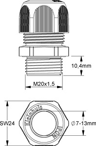 IPON-Kabelverschraubung geprüft nach DIN EN 62444, vollmetrisch, mit metrischem Anschlussgewinde nach DIN EN 60423, mit integrierter Zugentlastung, halogenfrei. VDE zertifiziert! Nenngröße : M 20 für Kabel-Ø : 7 - 13 mm Anschlussgewindelänge : 10,4 mm Schlüsselweite : 24 mm Glühdrahtprüfung nach VDE 0471/DIN IEC 695 Teil 2-1 : 850°C Schutzart : IP68, 5 bar Flammwidrigkeit : UL 94 V-O Einsatztemperaturbereich : -20° bis 100°C Werkstoff Verschraubungskörper : Polyamid Werkstoff Dichtring : TPE (Thermoplastische Elastomere) Farbton : tiefschwarz RAL : 9005 (ähnlich)