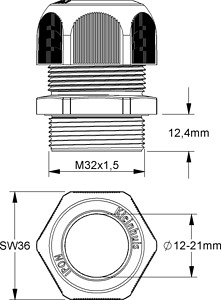 IPON-Kabelverschraubung geprüft nach DIN EN 62444, vollmetrisch, mit metrischem Anschlussgewinde nach DIN EN 60423, mit integrierter Zugentlastung, halogenfrei. VDE zertifiziert! Nenngröße : M 32 für Kabel-Ø : 12 - 21 mm Anschlussgewindelänge : 12,4 mm Schlüsselweite : 36 mm Glühdrahtprüfung nach VDE 0471/DIN IEC 695 Teil 2-1 : 850°C Schutzart : IP68, 5 bar Flammwidrigkeit : UL 94 V-O Einsatztemperaturbereich : -20° bis 100°C Werkstoff Verschraubungskörper : Polyamid Werkstoff Dichtring : TPE (Thermoplastische Elastomere) Farbton : silbergrau RAL : 7001 (ähnlich)
