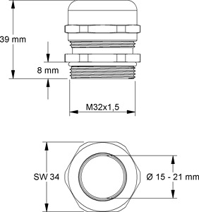 Kabelverschraubung, mit metrischem Anschlussgewinde nach DIN EN 60423, innenliegender Zugentlastung nach EN 50262 Ausführung A, mit Lamelleneinsatz und durchgehend isoliertem Dichtring sowie O-Ring am Anschlussgewinde. Nenngröße : M 32 für Kabel-Ø : 15 - 21 mm Anschlussgewindelänge : 8 mm Schlüsselweite : 34 mm Schutzart : IP68, 5 bar Einsatztemperaturbereich : -30° bis 120°C Werkstoff Verschraubungskörper : Messing vernickelt Lamelleneinsatz : PA Werkstoff Dichtring : Chloroprene (CR) Werkstoff O-Ring : NBR