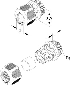 IPON-Kabelverschraubung, mit Pg-Anschlussgewinde nach DIN 40430. Nenngröße