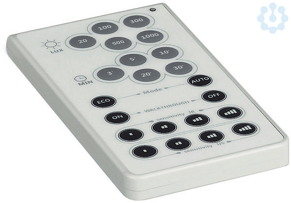 Infrarot-Fernbedienung zum Senden und Empfangen der Parametrierung, Parametrierungsmöglichkeiten: Helligkeitsschwellwert (stufenlos), Zeitverzögerung (stufenlos), Funktionsmodi (Automatik, Manuell, Walkthrough), Empfindlichkeit (Reichweite) der PIR- bzw. Ultraschall-Sensoren (stufenlos), Empfangen und Abspeichern der Parametrierung für oftmalige Verwendung, mit einer Fernbedienung kann man beliebig viele Sensoren parametrieren