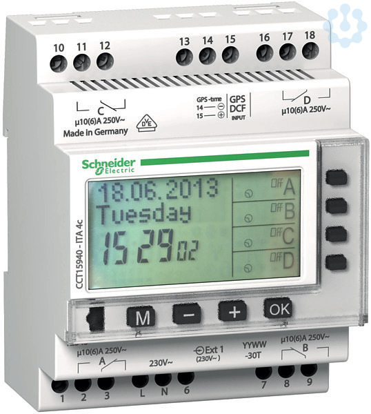 Acti 9, IHP, 4C Jahreszeitschalter, Diese Zeitschaltuhren arbeiten mitWochen- oder Jahresschaltung verteilt auf 1, 2, 3 oder 4 Kanäle. Überschreibsteuerung mit Schalter oder Drucktaster über externe Eingänge.