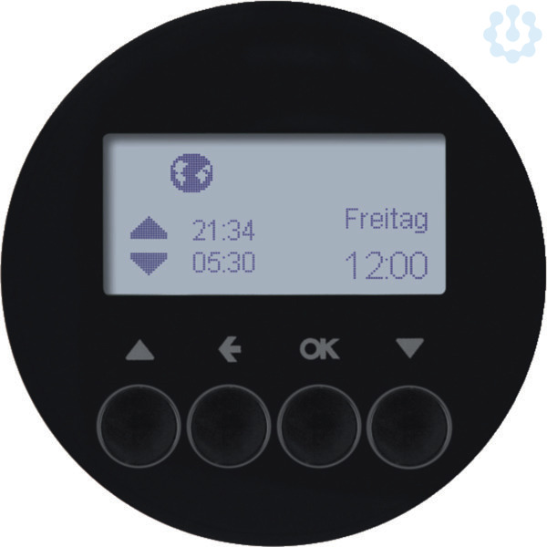 Jalousie-Schaltuhr R.1/R.3 schwarz, glänzend. Jalousie-Schaltuhr mit Display zum Aufstecken auf Jalousie-Einsätze der Elektronikplattform 2012, niedriger Eigenenergiebedarf, 2 unabhängige voreingestellte Programmspeicher individuell anpassbar, mit Umschaltung Hand-/Automatikbetrieb, Astroprogramm für Fahren bei Sonnenaufgang/-untergang mit Stadt/Land oder Koordinateneingabe, individuell anpassbar, Ferien-Programm zur zufälligen Variation der Fahrzeiten im Automatikbetrieb, mit Tastensperre, Party-Funktion, keine Ausführung von Automatik-, Funk- und Nebenstellenbefehlen (Aussperrsicherung), Resetfunktion (auf Werkseinstellung), mit automatischer Sommer-/Winterzeit-Umschaltung (abschaltbar), Anzeige der Aufsatz-/Einsatz-Kompatibilität im Display, LC-Display leuchtet während der Bedienung, LC-Display-Kontrast einstellbar, Menüführung in Deutsch, Englisch oder Französisch einstellbar, mit Demontageschutz. Unterputz-Installation, Flächen-/Designprogramm.