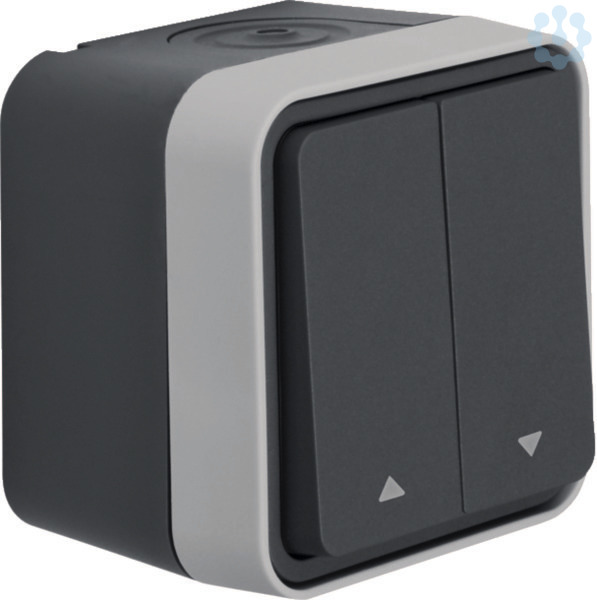 Jalousie-Serientaster mit Aufdruck Symbol Pfeil AP W.1, grau. Jalousie-Serientaster mit Aufdruck Symbol Pfeile AP, mit mechanischer und elektrischer Verriegelung als Sperre gegen beidseitiges Einschalten, mit Steckklemmen, mit einer Einführung für 2 Leitungen und einer Einführung für Leitung oder Rohr, vollflächige Dichtung unter dem Gehäuseboden zur Abdichtung der Gehäuserückseite, gut zugängliche, trichterförmige Montagelöcher in den Gehäusen, eine Wago 2-Leiter Verbindungsklemme für Verdrahtung beiliegend, zwei Einrastplätze für Wago 2-Leiter Verbindungsklemmen im Gehäuseboden, viel Platz zur Verdrahtung unter den Sockeln der Einsätze (Hohlboden), einfache Montage des Einsatzes im Gehäuse durch Einrasten, sichere Fixierung des Rahmens am Gehäuse über Bajonett-Schnellverschluss. Hinweise der Motorenhersteller beachten. Gehäuseschrauben aus Edelstahl Rostfrei. Aufputz-Installation. Material: Kunststoff, Thermoplast, schlagfest.