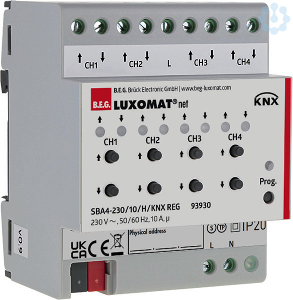 Die Jalousieaktoren KNX SBA empfangen KNX/EIB-Telegramme und steuern mehrere Jalousieantriebe mit Endlagenschaltern unabhängig voneinander, Jeder Kanal wird über zwei monostabile Relais geschaltet und kann zusätzlich über Taster am Aktor manuell betätigt werden, Jeder Kanal ist durch die ETS 3 und 4 individuell programmierbar. Zur Auswahl stehen Statusrückmeldungen, Sperrfunktionen, zentrale Schaltfunktionen sowie umfangreiche Kalibrier- und Positionierfunktionen, Die Schaltstellungen der Relais können für den Fall eines Busspannungsausfalles oder einer Wiederkehr individuell für jeden Kanal programmiert werden, Das Gerät ist zur festen Installation auf einer Hutprofilschiene in Starkstromverteilungen vorgesehen, Die Montage muss in trockenen Innenräumen erfolgen