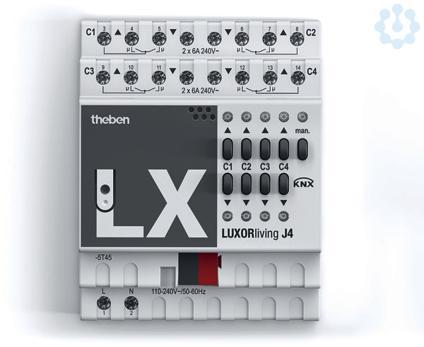 Jalousieaktor für das Smart Home System LUXORliving, 4-fach Antriebssteuerung, Relaisausgänge für 4 Antriebe, z. B. für Jalousien, Rollladen, Markisen, manuelle Bedienung am Gerät, Schlupfkorrektur, Antrieb frei parametrierbar, Handschalter AUF/AB und LEDs, 4 Schließer