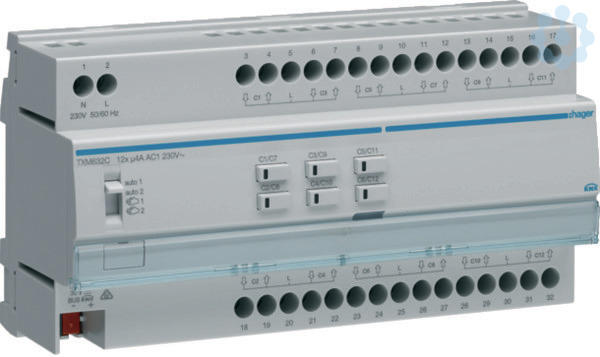 Rollladen-/Jalousieaktor 12-fach KNX easy, 230V. Jalousieaktor REG zur Ansteuerung eines AC-Antriebes je Aktorkanal für Jalousien, Rollladen oder Markisen. Reiheneinbaugerät mit integriertem Busankoppler, Schraubklemmen für Netzversorgung, KNX Busanschluss, Lastanschlüsse und Beschriftungsfeld. 6 Bedientasten (Kanal 1-6 und Umschaltung auf Kanal 7-12) für Handbetrieb je Ausgang mit Status-LED (Einflächenbedienung). Schiebeschalter Auto/Hand, beleuchtete Programmier-Taste. Funktionen: Rollladen-/Jalousiefunktion im Auf-/Ab-Betrieb mit Lamellenwinkelverstellung, Positionierungsfunktion und Lamellenverstellung für Jalousie in Prozent-Parametrierung. Statusobjekte für die Position der Lamellen in Prozent und der oberen/unteren Endlage. Zwangssteuerung mit Statusanzeige und 3 Alarmobjekte mit unterschiedlicher Prioritätssteuerung. Automatikfunktion de-/aktivierbar, 64 Szenenfunktionen pro Kanal und einstellbarer Sonnenschutzfunktion. Hinweis: Das Gerät lässt sich mittels easy Inbetriebnahme-Tool, easy-Konfiguratio