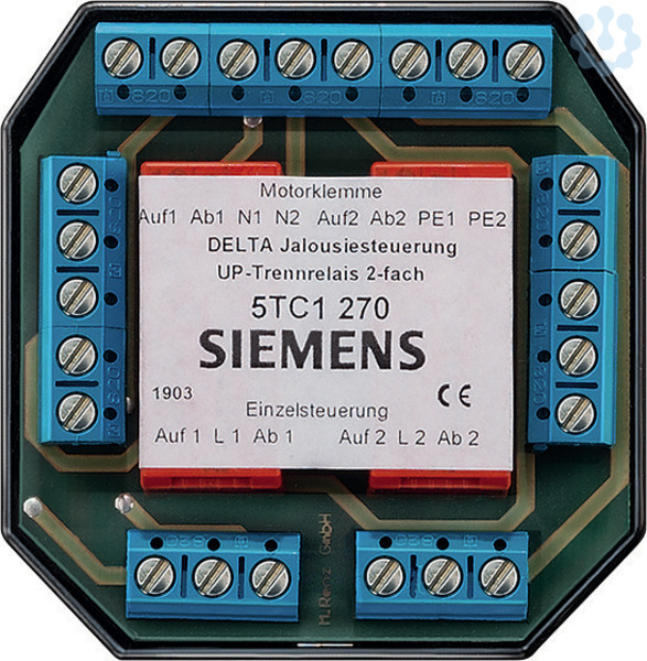 DELTA Jalousiesteuerung UP-Trennrelais 2-fach mit Einzelsteuerung AC 230V, 8A (AC 1) DELTA Schalter und Steckdosen - Design und Qualität in Perfektion von Siemens. Unsere umfangreiche Produktpalette bietet Ihnen durch ihre stilsichere Formen- und Farbvielfalt eine Fülle an individuellen Gestaltungsmöglichkeiten, die die Ästhetik eines jeden Raumes gekonnt unterstreichen. Auch Hochwertigkeit und Langlebigkeit unserer DELTA Schalter und Steckdosen können wir mit unserer hohen Kompetenz in der Herstellung garantieren - vom Einzelteil bis zum fertigen Produkt. Die Siemens Elektronik Geräte für die Installationstechnik bieten umfangreiche Zusatzfunktionen wie: 1. Dimmer für alle gängigen Lasten inclusive LED Beleuchtung. 2. Bewegungsmeldung in Aufputz und Unterputzausführung. 3. Weitere Geräte wie Jalousiesteuerung, Zeitschaltung und auch Raumtemperaturregelung sind verfügbar. www .de/delta. Siemens bietet für die sichere, effiziente elektrische Infrastruktur in Gebäuden und Industrie ein durchgängiges Port