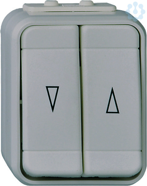 Jalousietaster, 10 A 250V AC. Farbe: licht-/basaltgrau, mit mechanischer u. elektrischer Verriegelung gegen gleichzeitige Betätigung, nach Entfernung der Rückstellfeder auch als Jalousieschalter verwendbar, für Aufputzmontage. Schutzart IP 44, mit zwei Leitungseinführungen, Steckklemmen: Klemmbereich für Informationsleitungen ab Leitungsdurchmesser 0,5mm, für Kupferleiter 1,5 mm und 2,5 mm.