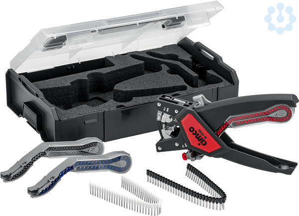 Quadro, die Zange mit 4 Funktionen für die rationelle und präzise Verarbeitung von isolierten Aderendhülsen in Bandform von 0, 5 - 2, 5 mm³, Funktionen zum Schneiden für Drähte und Litzen bis 2, 5 mm³, zum Abisolieren Arbeitsbereich 0, 5 - 2, 5 mm³, zum Verdrillen kein Aufspleißen der Drähte und somit sicheres Einführen des Leiters in die Aderendhülse, zum Crimpen einwandfreies Crimpen von 0, 5-2, 5 mm³ durch fachgerechte Trapezpressung, mit Koffer