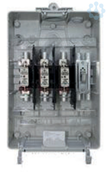 Kabel-Hausanschlusskasten nach DIN 43627 mit Doppeleinführung (Schleifkasten), Werkstoff: Polyester glasfaserverstärkt, Farbe: Lichtgrau, Gehäusedeckel scharniert, abnehmbar in 15° Stellung, 2-teilige Abdeckung über VNB- und Konsumentenanschlußraum, NH00 Unterteil 1x3-polig, Stahlrahmenklemmen KU00 im Zu- und Abgang: 10-95 qmm, Bemessungsbetriebsstrom: 100 A, Befestigung: Innen 4-Punkt, Höhe: 412 mm, Breite: 238 mm, Tiefe: 132 mm.