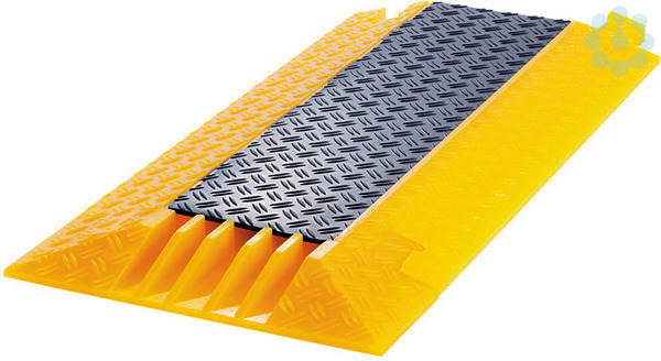 Eckverbindung 3-fach, zum Kabelbrückensystem 5.0, für die kurzzeitige, mobile Energieversorgung, Abmessungen: 900 x 450 x 450 x 50mm, Technische Daten: - Material, Polyurethan-Philan 44, - Warnfarbe gelb-schwarz, - bruchsicher, - temperaturbeständig, - schwer entflammbar Seite 6.01