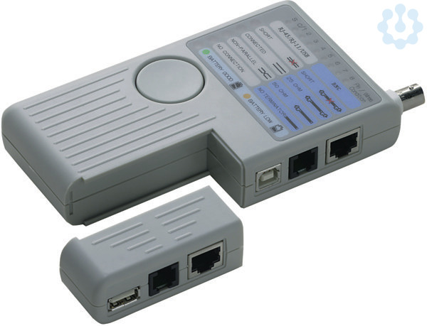 Kabeldetektiv, Testgerät für Netzwerk-Kupferkabel zur Aufspürung von Anschlussfehlern in konfektionierten Datenkabeln und kompletten Installationen, alle Koaxialverbindungen mit BNC/TNC-Steckern, USB-Kabel sowie sämtliche UTP/STP-Verkabelungen mit 6- oder 8-poligen Modularsteckverbindern lassen sich in Sekundenschnelle checken auf Unterbrechungen, PIN-Belegung und Kurzschlüsse, sowohl für die einzelnen Leiter wie auch für die Schirmung. Mit optischer (LED) und akustischer Fehleranzeige, die langwierige, nervenaufreibende und teure Suche Kabelfehlern wird mit dem Kabeldetektiv auf ein Minimum reduziert, bereits über längere Strecken verlegte Kabel bis zu 200m können von nur einer Person getestet werden, in praktischer Gürteltasche, umfassende Bedienungsanleitung, für 9-Volt-E-Block-Batterie
