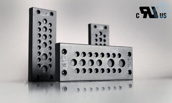 Elektroinstallation. Eigenschaften: Einführung der Kabel innerhalb von wenigen Minuten, Leichtes Einrasten der Platte in den Schaltschrank oder Gehäuse, Werkzeugfreie Montage, Hohe Packungsdichte, Reduzierung des Platzbedarfs um die Hälfte, Kabelschonend, Montierbar auf 24er Ausschnitt für Harting oder Wieland, Keine Störungen bei Datenleitungen. Zulassungen: UL, CSA und VDE