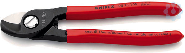 95 11 165 Kabelschere Zum Schneiden von Cu- und Al-Kabeln, ein- und mehrdrähtig. Schneidet glatt und sauber, ohne zu quetschen. Nicht für Stahldraht und hartgezogene Kupferleiter geeignet. Gehärtete Schneiden mit Präzisionsschliff. Leichter Schnitt bei Einhandbedienung. Mit Klemmschutz. Nachstellbares Schraubgelenk, selbstsichernd. - Schneidwert Cu-Kabel, mehrdrähtig: 50mm² - Schneidwert Cu-Kabel, mehrdrähtig: Ø 15mm - AWG: 1?/ 0