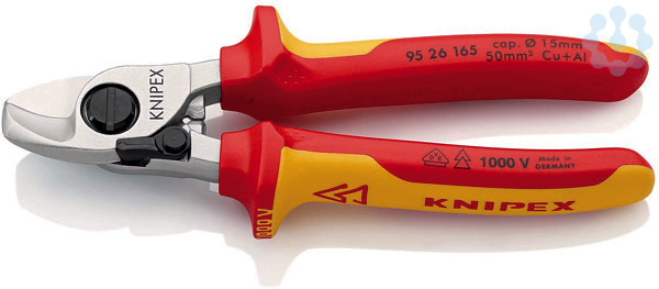 95 26 165 Kabelschere Zum Schneiden von Cu- und Al-Kabeln, ein- und mehrdrähtig. Schneidet glatt und sauber, ohne zu quetschen. Nicht für Stahldraht und hartgezogene Kupferleiter geeignet. Gehärtete Schneiden mit Präzisionsschliff. Leichter Schnitt bei Einhandbedienung. Mit Klemmschutz. Nachstellbares Schraubgelenk, selbstsichernd. im Gelenk liegende Öffnungsfeder, geschützt und unverlierbar. - Schneidwert Cu-Kabel, mehrdrähtig: 50mm² - Schneidwert Cu-Kabel, mehrdrähtig: Ø 15mm - AWG: 1?/ 0 - VDE-geprüft: Ja