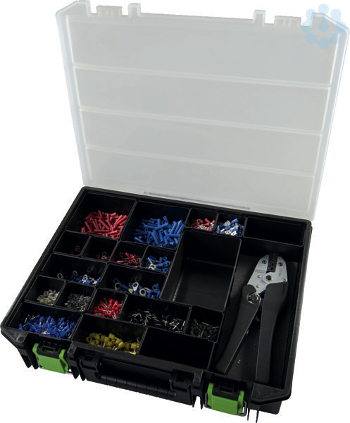 Sortimentskasten Combi-Crimp DINInhalt: 1 Crimpzange (210784) für isolierte Quetschkabelschuhe (0,5 - 2,5 mm²) und Aderendhülsen (0,5 - 6 mm²) 2.700 isolierte Aderendhülsen, 1.100 isolierte Quetschverbinder im Kunststoffkasten 415 x 335 x 90 mm. 500 Aderendhülsen 0,5/8, weiß, Art. 270801 500 Aderendhülsen 0,75/8, grau, Art. 270802 500 Aderendhülsen 1/8, rot, Art. 270805 500 Aderendhülsen 1,5/8, schwarz, Art. 270807 500 Aderendhülsen 2,5/8, blau, Art. 270811 100 Aderendhülsen 4/10, grau, Art. 270814 100 Aderendhülsen 6/12, gelb, Art. 270818 200 Stoßverbinder 0,25-1,5, Art. 260350 200 Stoßverbinder 1,5-2,5, Art. 260352 100 Flachsteckhülsen 0,25-1,5/6,3x0,8, Art. 260392 100 Flachsteckhülsen 1,5-2,5/6,3x0,8, Art. 260394 100 Ringkabelschuhe 0,25-1,5, M5, Art. 260258 100 Ringkabelschuhe 1,5-2,5, M4, Art. 260270 100 Ringkabelschuhe 1,5-2,5, M5, Art. 260272 100 Ringkabelschuhe 1,5-2,5, M6, Art. 260274 100 Ringkabelschuhe 0,25-1,5, M4, Art. 260256Inhalt: 1 Crimpzange (210784) für isolierte Quetschkabelschuhe (0,5 - 2,
