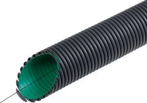 Kabuflex® R plus Typ 450 ist ein biegsames Kabelschutzrohr aus PE, in Farbe schwarz, halogenfrei, in Verbundbauweise mit optimierter grüner Innenhaut für den schnellen Kabeleinzug. Ein weiteres Merkmal ist die verbesserte Stabilität durch hochwertigen Materialeinsatz. Es ist außen gewellt, und hat eine einseitig aufgesteckte transparente Doppelsteckmuffe (sanddicht).