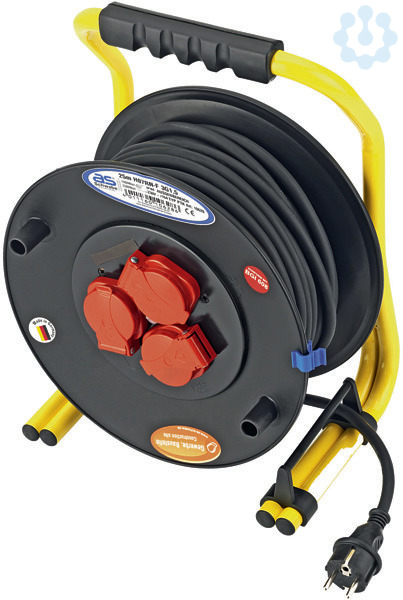 Kabeltrommel aus Spezial-Kunststoff mit Doppelrohrgestell (rot pulverbeschichtet), mit patentierter Kabelführung und 3 Profi-Schutzkontakt-Steckdosen 230 V 16A 3p mit Federklappdeckeln und Thermoschalter, Trommelkörper aus Spezialmaterial mit hartgummiähnlichen Eigenschaften und Lüftungsschlitzen für verbesserte Wärmeabfuhr. Zuleitung aus H07RN-F 3G1, 5, Schutzart IP 44. 25 m