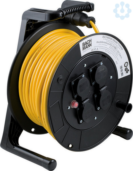 BACHMANN Meistertrommel 4xSchuko, schwarz, IP54, inkl. Thermosicherung Trommel aus Spezialkunststoff, schwarz 40m N07V3V3-F3G1,5, gelb,Baustellenleitung Österreich (ehemals XYMM-J) Schutzkontakt-Zentralstecker In Kartonbox verpackt DGUV-I 203-006 konform