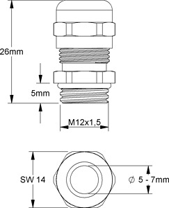 Kabelverschraubung, mit metrischem Anschlussgewinde nach DIN EN 60423, Dichtring sowie O-Ring am Anschlussgewinde, mit langem ausstoßbaren Dichteinsatz (Vollisolation), halogenfrei und silikonfrei. Nenngröße : M 12 für Kabel-Ø : 5 - 7 mm Anschlussgewindelänge : 5 mm Schlüsselweite : 14 mm Schutzart : IP68, 5 bar Einsatztemperaturbereich : -40° bis 120°C Werkstoff Verschraubungskörper : Messing vernickelt Werkstoff einteiliger Dichtring : TPE Werkstoff O-Ring : NBR