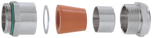 Druckwasserdichte, hochtemperaturbeständige Kabelverschraubung mit konischem Spezialdichtungselement aus FKM, Ziegelwerke, Kläranlagen, Autowaschanlagen, Für hohe Temperaturen, Beständig gegen Öle, Lösungsmittel, Säuren und Chemikalien, Druckwasserdicht, Hohe Zugentlastung, Robust, 1 Zwischenstutzen, 2 Unterlagscheibe, 3 FKM-Dichtkonus, 4 Messingkonus, 5 Druckschraube,