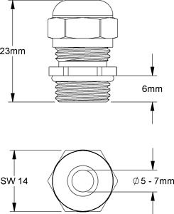 Kabelverschraubung, mit Pg-Anschlussgewinde nach DIN 40430, Dichtring sowie O-Ring am Anschlussgewinde, mit langem ausstoßbaren Dichteinsatz (Vollisolation), halogenfrei und silikonfrei. Nenngröße : Pg 07 für Kabel-Ø : 5 - 7 mm Anschlussgewindelänge : 6 mm Schlüsselweite : 14 mm Schutzart : IP68, 5 bar Einsatztemperaturbereich : -40° bis 120°C Werkstoff Verschraubungskörper : Messing vernickelt Werkstoff einteiliger Dichtring : TPE Werkstoff O-Ring : NBR