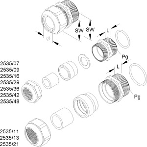 Kabelverschraubung, mit langem Pg-Anschlussgewinde nach DIN 40430, Dichtring sowie O-Ring am Anschlussgewinde, halogenfrei. Nenngröße