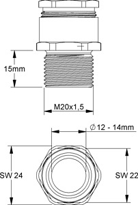 Kabelverschraubung mit langem metrischem Anschlussgewinde nach DIN EN 60423, mit Sechskant-Zwischenstutzen, mit Druckringe und Dichtring, halogenfrei. Nenngröße : M 20 für Kabel-Ø : 12 - 14 mm Anschlussgewindelänge : 15 mm Schlüsselweite 1 : 22 mm Schlüsselweite 2 : 24 mm Einsatztemperaturbereich : -40° bis 100°C Schutzart : IP54 mit Anschlussgewinde-Dichtring 987M...(bitte gesondert bestellen!) : IP65 Werkstoff Verschraubungskörper : Messing, vernickelt Werkstoff Druckring : galvanisch verzinkt blaupassivierter Stahl Werkstoff Dichtring