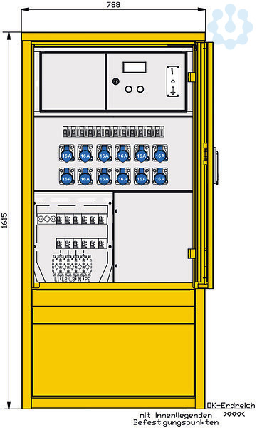 Gehäuse aus Edelstahl (Werkstoff 1.4301) mit Lackierung RAL 7032 -grau- mit Bodenflanschplatte und innenliegenden Bohrungen zur Befestigung mit Einfachtür und 3-Punkt-Stangenschloss mit Profilhalbzylinder, Schließung G2123 sowie Kunststoff-Regenschutzkappe Einbauten bis einschl. RCD-Schutzschalter schutzisoliert vordere Blende zur Montage abnehmbar Kabelausführung bei geschlossener Tür möglich Schutzart: IP 44 Größe ca.: 1615 x 785 x 360mm / H-B-T