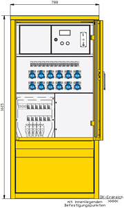 Gehäuse aus Edelstahl (Werkstoff 1.4301) mit Lackierung RAL 7032 -grau- mit Bodenflanschplatte und innenliegenden Bohrungen zur Befestigung mit Einfachtür und 3-Punkt-Stangenschloss mit Profilhalbzylinder, Schließung G2123 sowie Kunststoff-Regenschutzkappe Einbauten bis einschl. RCD-Schutzschalter schutzisoliert vordere Blende zur Montage abnehmbar Kabelausführung bei geschlossener Tür möglich Schutzart: IP 44 Größe ca.: 1615 x 785 x 360mm / H-B-T