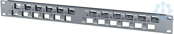 Keystone 19 Zoll Modulträger 1HE 24 Port , gewinkelt, unbestückt, geschirmt, für 24 Einzelmodule in Keystonebauform, Modulträgerfront aus pulverbeschichtetem Stahlblech, optimiert für 10 GE in Verbindung mit den UTP Cat.6, A Modulen, Portöffnungen gewinkelt, Port 1 - 12 ca. 30° nach rechts, Port 13 - 24 ca. 30° nach links, Modulhalter aus verzinktem Stahlblech, zusätzliche Zugentlastung am Modulhalter mittels Kabelbinder möglich, Erdungsschraube mit Zahnscheibe, inkl. ca. 40 cm Erdungskabel, alle vollgeschirmten Module sind über den Modulträger verbunden