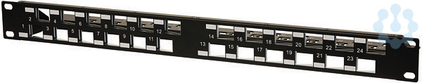 Keystone 19 Zoll Modulträger 1HE 24 Port , gewinkelt, unbestückt, geschirmt, für 24 Einzelmodule in Keystonebauform, Modulträgerfront aus pulverbeschichtetem Stahlblech, optimiert für 10 GE in Verbindung mit den UTP Cat.6, A Modulen, Portöffnungen gewinkelt, Port 1 - 12 ca. 30° nach rechts, Port 13 - 24 ca. 30° nach links, Modulhalter aus verzinktem Stahlblech, zusätzliche Zugentlastung am Modulhalter mittels Kabelbinder möglich, Erdungsschraube mit Zahnscheibe, inkl. ca. 40 cm Erdungskabel, alle vollgeschirmten Module sind über den Modulträger verbunden