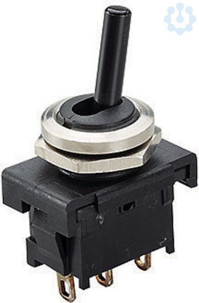 Kippschalter Serie 8400 6(4) A 250V Umschalter, 1polig, Lötanschluss Geeignet für Geräte der Schutzklasse II, Zentralbefestigung M 12x0,75mm, Sechskant- und Rädelmutter aufgeschraubt, Kipphebel und Gehäuse aus Thermoplast, Kontake aus Silber, Anschlüsse versilbert, geeignet zum sek. schalten von Halogenleuchten