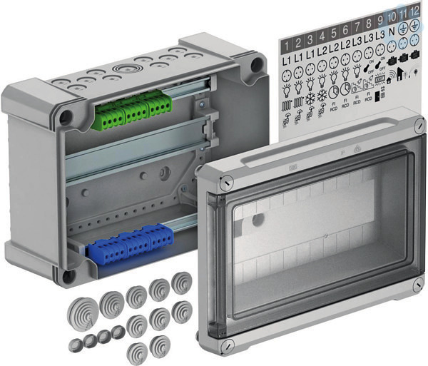 Die OBO Kleinverteiler-Serie sorgt für eine sichere Stromverteilung im Innen- und Außenbereich. Die Aufputz-Kleinverteiler erfüllen alle Anforderungen nach IEC 439-3 und sind in vier verschiedenen Größen mit drei bis zwölf Teilungseinheiten erhältlich. Es gibt drei Ausstattungsvarianten: mit Schraubklemmen, mit Steckklemmen und ohne Klemmen. Alle Größen und Ausstattungsvarianten sind in zwei Materialien verfügbar. Alle Kleinverteiler werden mit einer vormontierten 35 mm Hutprofil-Tragschiene geliefert. Die Kleinverteiler mit Klemmleisten enthalten außerdem ein Zubehörset, das unter anderem einen Aufkleberbogen umfasst. Die selbstklebenden Piktogramme machen die oft lästige Beschriftung der einzelnen Teilungseinheiten überflüssig. Sollte doch einmal eine Beschriftung notwendig sein, sind auch hierfür entsprechende Aufkleber auf dem Aufkleberbogen vorhanden. Die hohe Schutzart (IP66) und die robuste Konstruktion (IK07 bei -25C) sorgen auch bei schwierigen Umgebungsbedingungen für einen sicheren Betrieb. Der erh