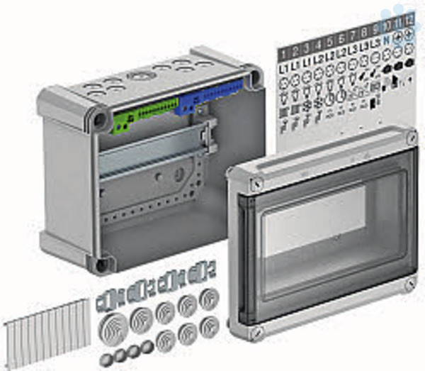 Die OBO Kleinverteiler-Serie sorgt für eine sichere Stromverteilung im Innen- und Außenbereich. Die Aufputz-Kleinverteiler erfüllen alle Anforderungen nach IEC 439-3 und sind in vier verschiedenen Größen mit drei bis zwölf Teilungseinheiten erhältlich. Es gibt drei Ausstattungsvarianten: mit Schraubklemmen, mit Steckklemmen und ohne Klemmen. Alle Größen und Ausstattungsvarianten sind in zwei Materialien verfügbar. Alle Kleinverteiler werden mit einer vormontierten 35 mm Hutprofil-Tragschiene geliefert. Die Kleinverteiler mit Klemmleisten enthalten außerdem ein Zubehörset, das unter anderem einen Aufkleberbogen umfasst. Die selbstklebenden Piktogramme machen die oft lästige Beschriftung der einzelnen Teilungseinheiten überflüssig. Sollte doch einmal eine Beschriftung notwendig sein, sind auch hierfür entsprechende Aufkleber auf dem Aufkleberbogen vorhanden. Die hohe Schutzart (IP66) und die robuste Konstruktion (IK07 bei -25C) sorgen auch bei schwierigen Umgebungsbedingungen für einen sicheren Betrieb. Der erh