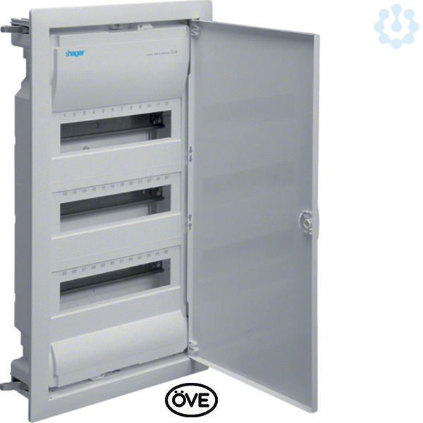 Kleinv.,Volta,HWV,3x12PLE,IP30,Stahlbl.tür,595x314,5x87mm Ausschnittmass. Installationskleinverteiler Hohlwand aus Kunststoff, nach OVE EN 60670-24, geeignet zum Einsatz in Wohngebäuden nach ÖVE E 8001 - Reihe und OVE E 8101. Zum Einbau von Geräten bis 63 A mit 70 mm Einbautiefe nach Maßnorm DIN 43880, Bemessungsspannung 400V/50Hz. Schutzart IP30, Schutzklasse II schutzisoliert. Bestehend aus: Kunststoff-Mauerkasten mit serienmäßigem Leitungsabfang und ausbrechbaren Leitungseinführungsschiebern mit Schnappbefestigung sowie integrierter Wasserwaage. Hohlwandbefestigung mit Schnellfixierungshebel, seitlich oder oben/unten montierbar. Geräteträger aus verzinktem Stahlblech, Hutschienen einzeln isoliert einbaubar. Geräteabdeckung aus Kunststoff mit 46 mm Geräteschlitz, Schnellverschlussbefestigung mit 90° Drehung, serienmäßig plombierbar. Verdrehbarer Blendrahmen mit Tür aus Stahlblech, pulverbeschichtet und eingebrannt, mit 15 mm Putzausgleich. Tür, frontbündig mit innenliegenden handbedienbaren Scharnieren. Tür