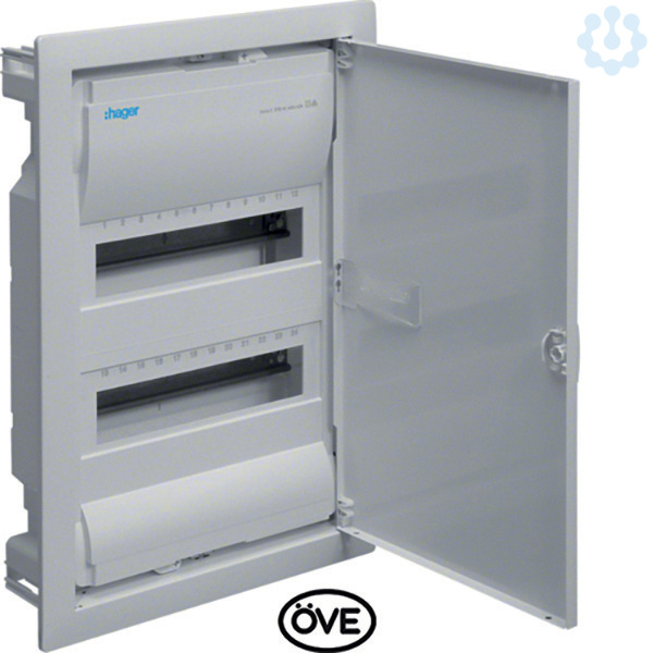Kleinv.,Volta,UPV,2x12PLE,IP30,Stahlbl.tür,340x335x90mm Nischenmaß. Installationskleinverteiler Unterputz aus Kunststoff, nach OVE EN 60670-24, geeignet zum Einsatz in Wohngebäuden nach ÖVE E 8001 - Reihe und OVE E 8101. Zum Einbau von Geräten bis 63 A mit 70 mm Einbautiefe nach Maßnorm DIN 43880, Bemessungsspannung 400V/50Hz. Schutzart IP30, Schutzklasse II schutzisoliert. Bestehend aus: Kunststoff-Mauerkasten mit serienmäßigem Leitungsabfang und ausbrechbaren Leitungseinführungsschiebern mit Schnappbefestigung, integrierter Wasserwaage und verzinkten Stahlblech-Befestigungslaschen. Geräteträger aus verzinktem Stahlblech, Hutschienen einzeln isoliert einbaubar. Geräteabdeckung aus Kunststoff mit 46 mm Geräteschlitz, Schnellverschlussbefestigung mit 90° Drehung, serienmäßig plombierbar. Verdrehbarer Blendrahmen mit Tür aus Stahlblech, pulverbeschichtet und eingebrannt, mit 15 mm Putzausgleich. Tür, frontbündig mit innenliegenden handbedienbaren Scharnieren. Türverschluss mit frontbündiger Griffmulde und selbs