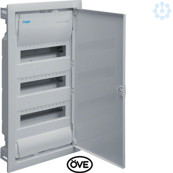 Kleinv.,Volta,UPV,3x12PLE,IP30,Stahlbl.tür,615x335x90mm Nischenmaß. Installationskleinverteiler Unterputz aus Kunststoff, nach OVE EN 60670-24, geeignet zum Einsatz in Wohngebäuden nach ÖVE E 8001 - Reihe und OVE E 8101. Zum Einbau von Geräten bis 63 A mit 70 mm Einbautiefe nach Maßnorm DIN 43880, Bemessungsspannung 400V/50Hz. Schutzart IP30, Schutzklasse II schutzisoliert. Bestehend aus: Kunststoff-Mauerkasten mit serienmäßigem Leitungsabfang und ausbrechbaren Leitungseinführungsschiebern mit Schnappbefestigung, integrierter Wasserwaage und verzinkten Stahlblech-Befestigungslaschen. Geräteträger aus verzinktem Stahlblech, Hutschienen einzeln isoliert einbaubar. Geräteabdeckung aus Kunststoff mit 46 mm Geräteschlitz, Schnellverschlussbefestigung mit 90° Drehung, serienmäßig plombierbar. Verdrehbarer Blendrahmen mit Tür aus Stahlblech, pulverbeschichtet und eingebrannt, mit 15 mm Putzausgleich. Tür, frontbündig mit innenliegenden handbedienbaren Scharnieren. Türverschluss mit frontbündiger Griffmulde und selbs