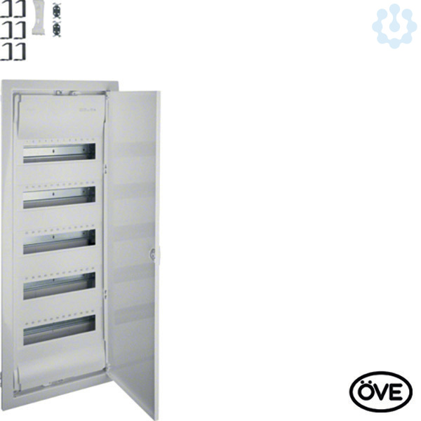 Kleinv.,Volta,UPV,5x12PLE,IP30,Stahlbl.tür,865x335x90mm Nischenmaß. Installationskleinverteiler Unterputz aus Kunststoff, nach OVE EN 60670-24, geeignet zum Einsatz in Wohngebäuden nach ÖVE E 8001 - Reihe und OVE E 8101. Zum Einbau von Geräten bis 63 A mit 70 mm Einbautiefe nach Maßnorm DIN 43880, Bemessungsspannung 400V/50Hz. Schutzart IP30, Schutzklasse II schutzisoliert. Bestehend aus: Kunststoff-Mauerkasten mit serienmäßigem Leitungsabfang und ausbrechbaren Leitungseinführungsschiebern mit Schnappbefestigung, integrierter Wasserwaage und verzinkten Stahlblech-Befestigungslaschen. Geräteträger aus verzinktem Stahlblech, Hutschienen einzeln isoliert einbaubar. Geräteabdeckung aus Kunststoff mit 46 mm Geräteschlitz, Schnellverschlussbefestigung mit 90° Drehung, serienmäßig plombierbar. Verdrehbarer Blendrahmen mit Tür aus Stahlblech, pulverbeschichtet und eingebrannt, mit 15 mm Putzausgleich. Tür, frontbündig mit innenliegenden handbedienbaren Scharnieren. Türverschluss mit frontbündiger Griffmulde und selbs