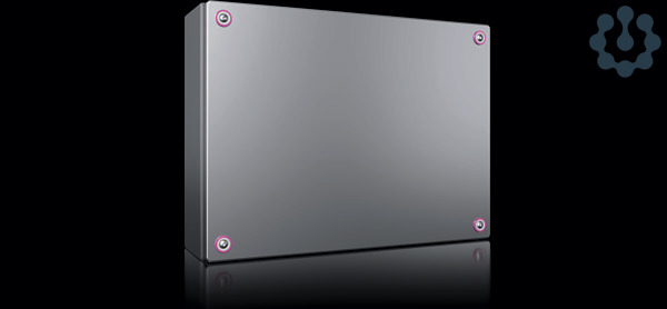 vor einem schwarzen Hintergrund mit pinkem Schein links sind mittig zwei Gehäuse für Schaltschränke ausgestellt und links das Rittal Logo