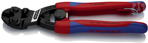 71 22 200 T KNIPEX CoBolt® Mit Präzisionsschneiden für weichen, harten Draht sowie Pianodraht. Schneidet Bauteile wie Bolzen, Nägel, Niete usw. bis Ø 5,2 mm. Besonders hohe Schneidleistung bei geringerem Kraftaufwand durch höchst effiziente Gelenkkonstruktion. Schneiden zusätzlich induktiv gehärtet, Schneidenhärte ca. 64 HRC. In die Griffhüllen integrierte Öffnungsfeder und Verriegelung für komfortables Arbeiten und sicheren Transport. mit schlanken Mehrkomponenten-Hüllen ohne Kragen für besseres Handling und einfacheren Transport. Zange mit Befestigungsöse zum Anbringen einer Absturzsicherung. 20° gewinkelter Kopf mit einseitiger Lasche und Seitenschnitt zum nahezu flächenbündigen Schneiden, mit Freiraum zum Greifen. - Schneidwerte weicher Draht (Durchmesser): Ø 6mm - Schneidwerte mittelharter Draht (Durchmesser): Ø 5,2mm - Schneidwerte harter Draht (Durchmesser): Ø 4,0mm - Schneidwerte Pianodraht (Durchmesser): Ø 3,6mm - Absturzsicherung: Ja