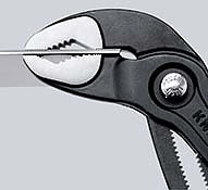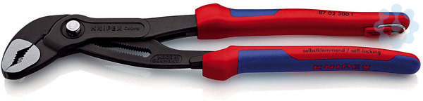 87 02 300 T KNIPEX Cobra® Einstellung per Knopfdruck direkt am Werkstück. Feinverstellung für optimale Anpassung an verschiedene Werkstückgrößen und handfreundliche Griffstellung. Selbstklemmend an Rohren und Muttern: kein Abrutschen am Werkstück, kraftsparendes Arbeiten. Greifflächen mit spezialgehärteten Zähnen, Härte der Zähne ca. 61 HRC: dauerhaft sicheres Greifen durch hohe Verschleißfestigkeit. Durchgestecktes Gelenk: hohe Stabilität durch doppelte Führung. Sicheres Einrasten des Gelenkbolzens: keine unbeabsichtigte Verstellung. Klemmschutz verhindert Quetschverletzungen. Zange mit Befestigungsöse zum Anbringen einer Absturzsicherung. - Einstellpositionen: 30 - Kapazität für Muttern, Schlüsselweite (Zoll): Ø 2 3/4 - Kapazität für Muttern, Schlüsselweite (mm): 60mm - Kapazität für Rohre (Durchmesser): Ø 70mm - Absturzsicherung: Ja