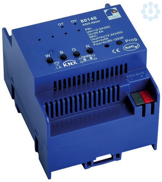Konstantspannung 4 Kanäle einfarbig oder mehrfarbig einstellbar über Software Systemvoraussetzung : ETS 3.0F oder höher 4 unabhängige Kanäle 5A pro Kanal IP20 Schutz gegen Kurzschluss,Überspannung und Übertemperatur manuelle Einstellung am Gerät möglich optische Warnung per LED für Übertemperatur und Überspannung optische LED Anzeige für Normalbetrieb und Adresseinstellung EN60529 Leistung: 4x60(12V),4x120W(24V) Input und Output 12V-24V DC LxBxH in mm: 90 x 71,5 x 67,5 Temperaturbereich: -20°C bis +50°C